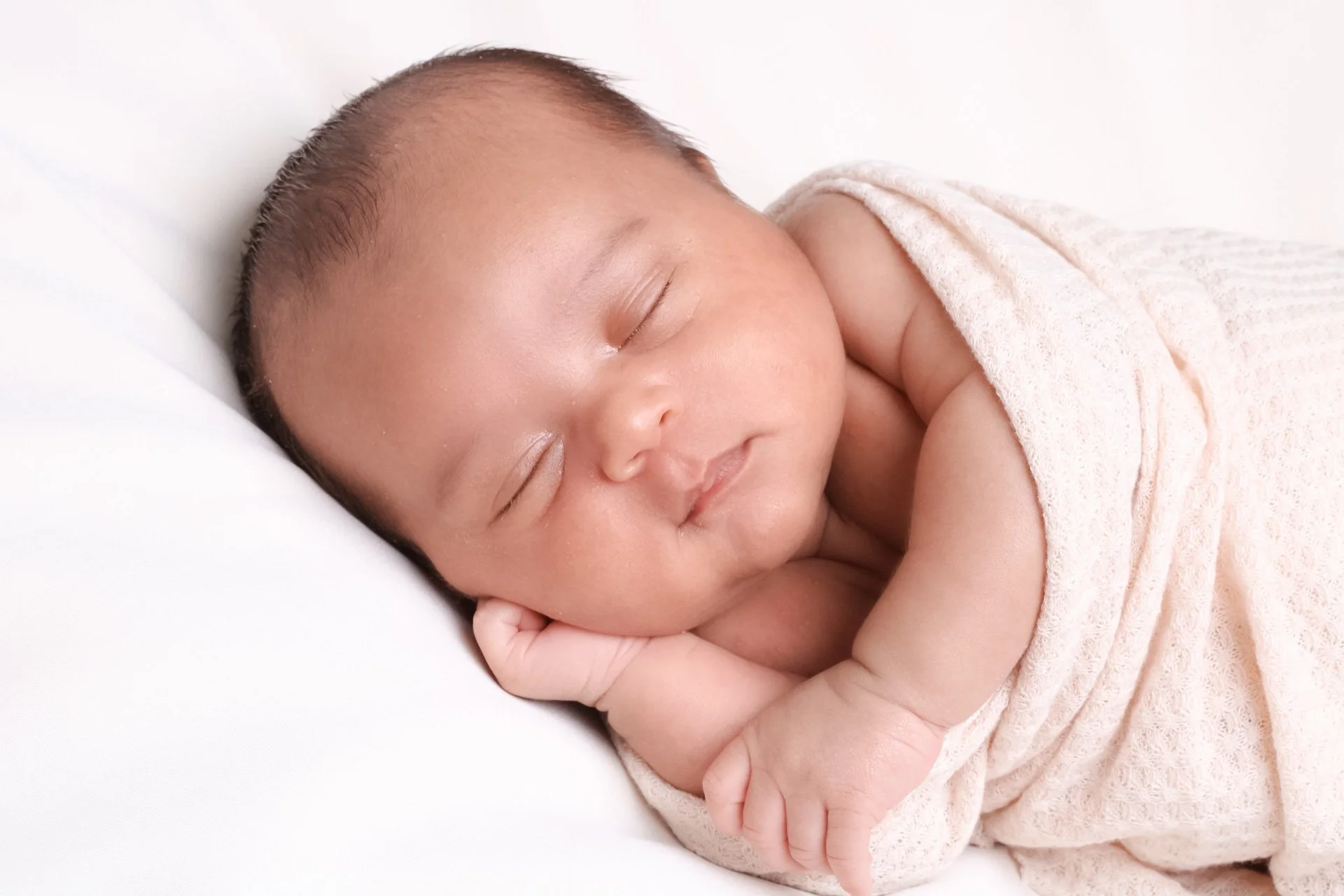 A sleeping baby with a peaceful expression, resting on a white surface, wrapped in a light pink blanket.