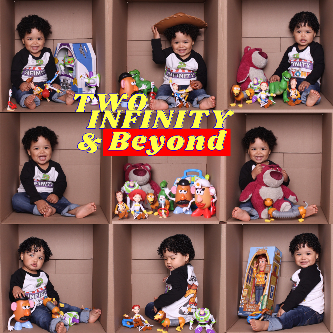 Six young children with curly hair sitting in cardboard boxes surrounded by Toy Story toys and plush animals. The children are wearing black and white 'Infinity & Beyond' shirts, smiling, and playing with toys.